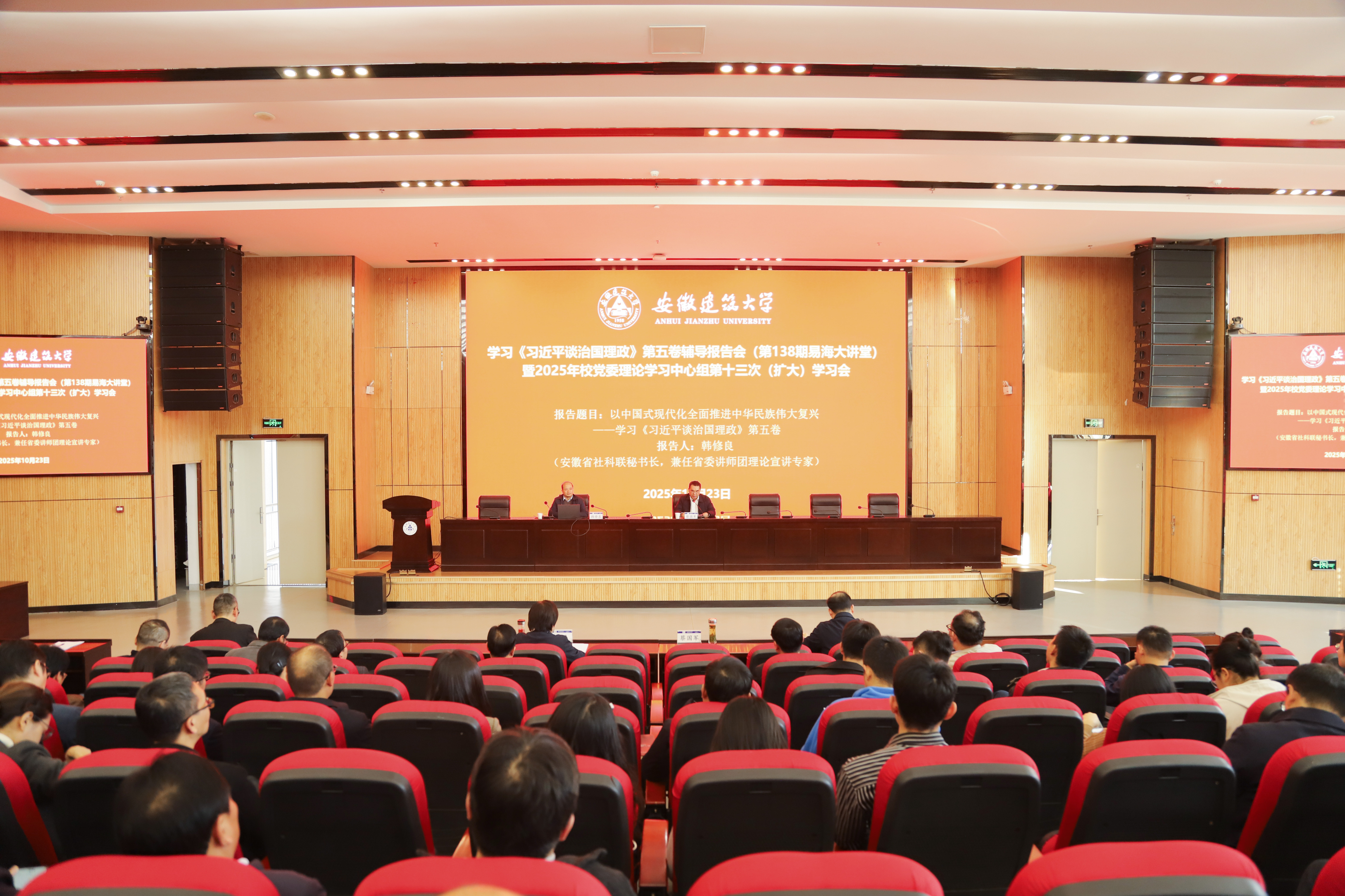 本网讯 10月23日,学校召开2025年党委理论学习中心组第十三次(扩大)学习会,传达学习习近平总书记在庆祝中华人民共和国成立76周年招待会上的重要讲话精神、给天津大学和中国农业大学全体师生的重要回信精神等。邀请安徽省社科联秘书长、省委讲师团理论宣讲专家韩修良作学习《习近平谈治国理政》第五卷辅导报告。校党委副书记、校长蔡国军主持学习会并讲话。