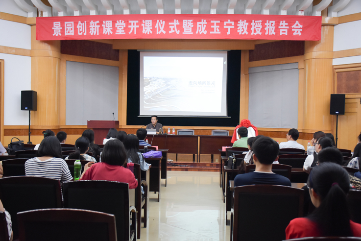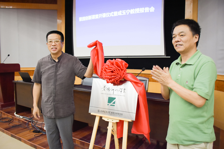 当日下午,我校景园创新课堂开课仪式暨成玉宁教授报告会在建筑馆学术报告厅举行。仪式前,我校景观系负责人简单介绍了景园创新课堂的开设背景以及课堂的建设情况,并对成玉宁教授为课堂的建设给予的支持表示感谢。建筑与规划学院副院长刘仁义教授主持了开课仪式,并与成玉宁教授一起为景园创新课堂揭牌。