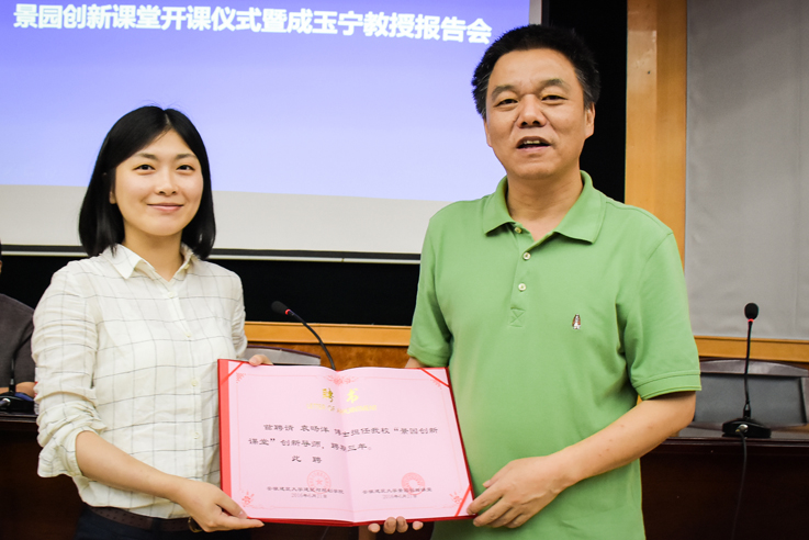 成玉宁教授的科研助理、东南大学青年教师袁旸洋博士受聘为景园创新课堂“创新导师”,刘仁义为其颁发了聘书。袁旸洋表示,非常荣幸能够加入安徽建筑大学的大家庭,希望借助景园创新课堂的平台与大家多多交流在风景园林规划设计中的心得与体会。