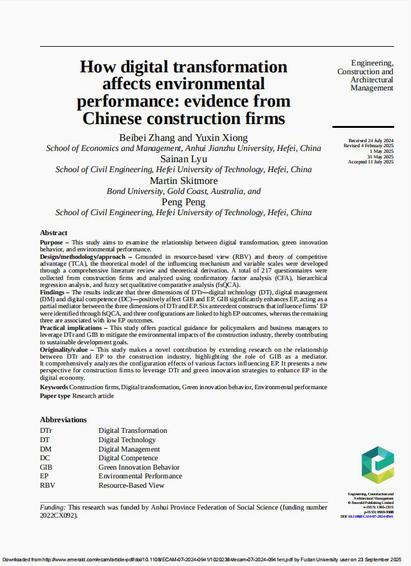 本网讯 近日,我校经济与管理学院硕士研究生熊雨欣发表了题为“How digital transformation affects environmental performance: evidence from Chinese construction firms”的研究成果。论文刊于英国Emerald出版社出版的工程管理领域国际权威期刊《Engineering, Construction and Architectural Management》。该期刊为SCI/SSCI双检索期刊,位列中科院二区、JCR一区,近5年平均影响因子为4.7。论文指导老师为章蓓蓓教授,熊雨欣为第二作者,安徽建筑大学经济与管理学院为第一完成单位。