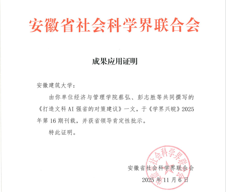 本网讯 日前,我校经管学院“人工智能快速发展对高等教育带来的新机遇和新挑战”课题组研究成果《打造文科AI强省的对策建议》获《学界兴皖》2025年第16期刊载,省领导对报送的对策建议成果作出肯定性批示。