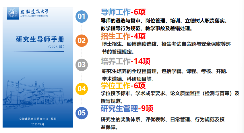 顶层设计系统化,制度体系持续完善。学校聚焦招生、培养、学位、导师等关键环节,加强制度“废改立释”。“十四五”期间,累计新建、修订《安徽建筑大学招收攻读博士学位研究生工作管理办法》等核心规章制度32项。《中华人民共和国学位法》颁布后,学校及时修订学位授予、论文盲审等5项核心制度,完成校院两级学位评定委员会调整,推动治理体系与时俱进。