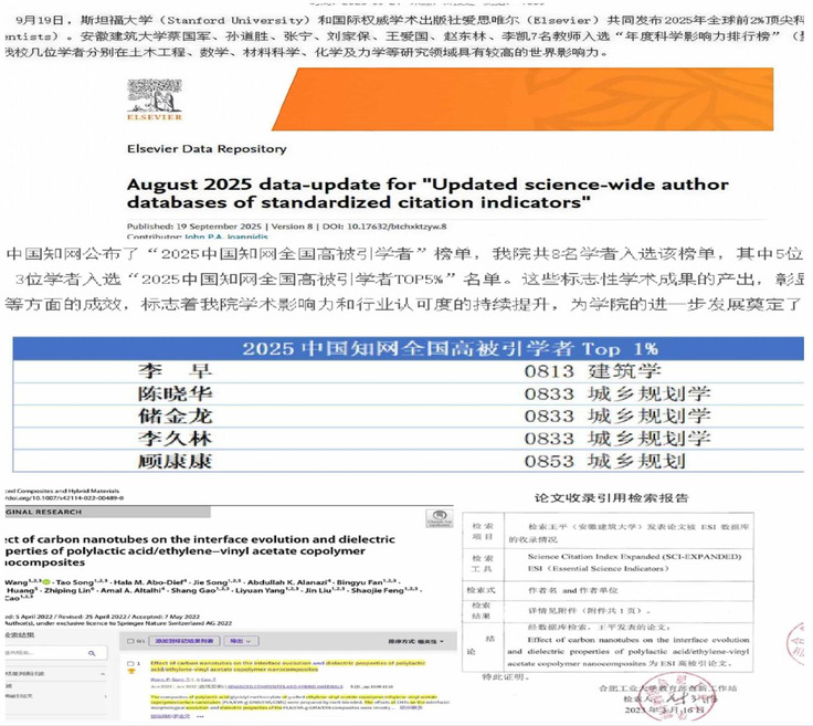 学科布局持续优化,核心竞争力提升。“十四五”期间,学校学科生态持续优化。土木工程、建筑学、城乡规划学3个安徽省高峰学科建设绩效持续获评良好;材料科学与工程、环境科学与工程2个学科获批安徽省应用型高峰培育学科。国际学术影响力取得突破,工程学、化学、材料科学3个学科相继进入ESI全球排名前1%,环境与生态学学科潜力值显著提升,学科核心竞争力和可持续发展能力实现了整体跃升。