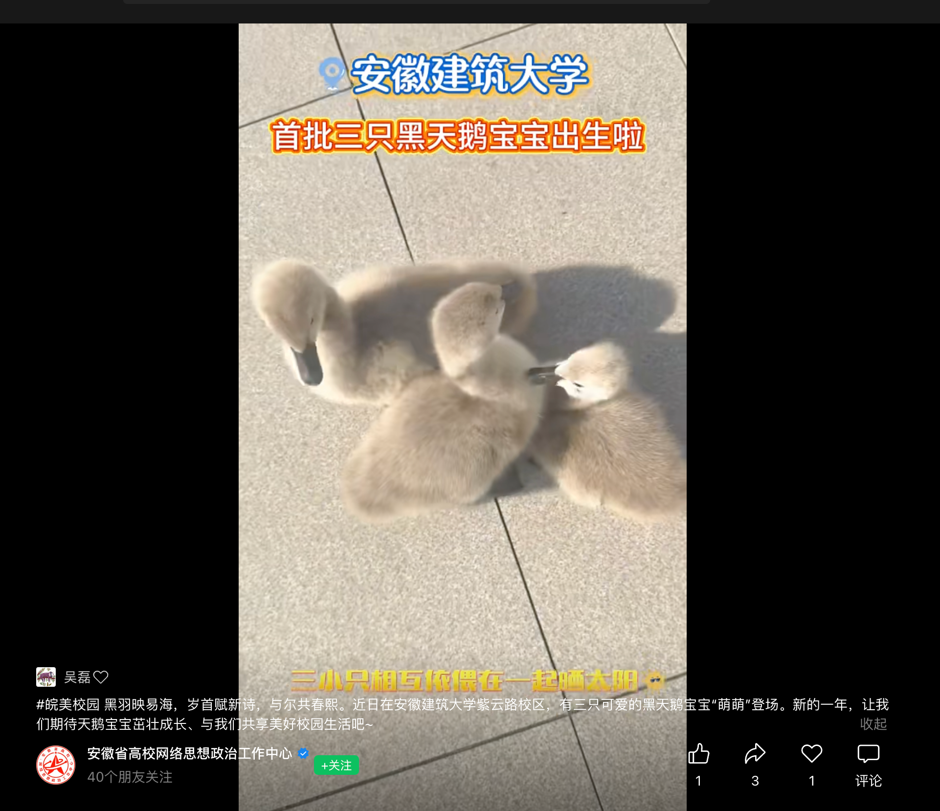 安徽省高校网络思想政治中心:安徽建筑大学黑天鹅宝宝“萌萌”登场