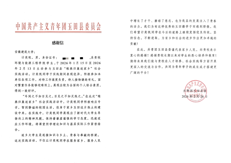 本网讯 近日,学校收到一封来自河北省玉田县共青团的感谢信。对安徽建筑大学环境与能源工程学院2023级能源专业学生计奕帆参加当地2026年寒假“雏燕归巢返家乡”社会实践活动中的突出表现给予了高度认可,并表达了诚挚感谢。