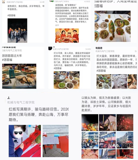 寒假怎能少了年味?机电学院易班工作站的第四届“机聚中国味,易同贺新春”集五福主题活动,让年味在云端发酵,在指尖传递。“纳健康福”——同学们晒出“健康版”年夜饭,寓意吉祥、搭配科学,既有舌尖上的年味,也有围炉夜话的温情。“赢运动福”——登高祈福、踏雪寻梅、舞龙舞狮,镜头下的每一个动感瞬间,都在为新春增添一抹跃动的亮色。“享团圆福”——贴春联、挂灯笼、包饺子、看春晚,一幕幕熟悉的年俗场景,被用心记录、用情讲述。“秀创意福”——手写春联、剪纸黏土、手工装饰,当传统年俗邂逅青春创意,焕发出别样的光彩。“晒家乡福”——张灯结彩的老街、银装素裹的山川、独具特色的地标,一幅幅影像交织成温暖明亮的新春图景。这场云端“集福”,不仅是记录与分享,更是一场关于文化认同的青春表达。