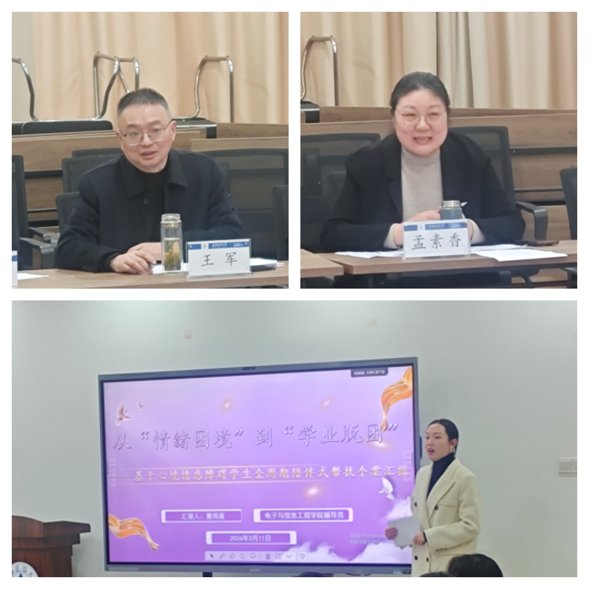 本次研讨的学生心理案例来自电信学院副站长曹雨葳,她系统呈报了对一名存在严重心理困扰学生长达七个月的陪伴式帮扶过程,重点介绍了通过建立深度信任关系,构建覆盖心理、学业、安全及家校协同的全方位支持体系,最终帮助学生逐步回归良好状态的核心做法与反思。