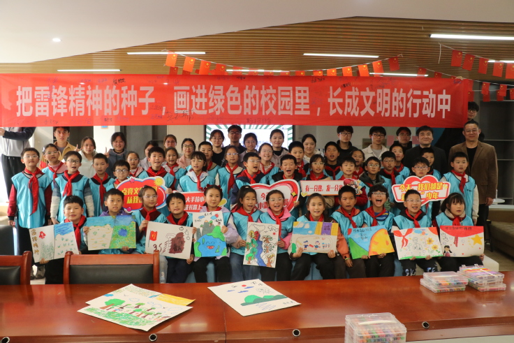实践环节结束后,全体人员齐聚“一站式”学生社区开展主题学习交流。师生共同观看雷锋先进事迹纪录片与生态文明建设科普宣传片,结合影片内容畅谈感悟、交流心得,在思想碰撞中深化精神认知,在互动分享中凝聚文明共识。随后,大学生与小学生组队执笔作画,以丹青绘心中雷锋模样,以笔墨描绿色校园愿景,让雷锋精神与生态理念跃然纸上。活动尾声,全体学子在“把雷锋精神的种子,画进绿色的校园里,长成文明的行动中”主题横幅上郑重签名,许下传承雷锋精神、共建文明校园的庄严承诺,让精神火种落地生根、薪火相传。