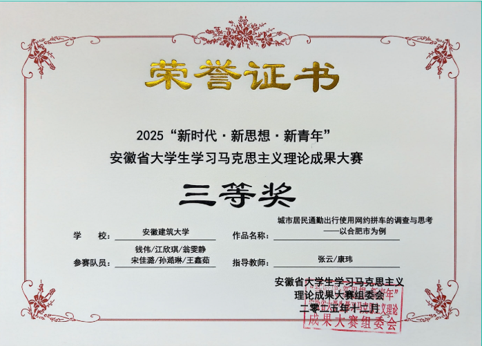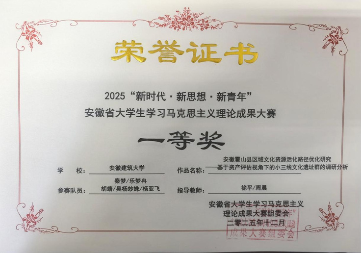 安徽省大学生学习马克思主义理论成果大赛是安徽省高校马克思主义理论类唯一一项B类赛事,吸引了来自全省众多高校的广泛参与。自启动校级选拔赛以来,马克思主义学院精心组织,参赛学生积极备赛,指导教师认真辅导,对作品进行反复打磨,遴选出优秀作品参加省赛。最终经过省赛专家评审,秦梦团队的社会实践报告《安徽霍山县区域文化资源活化路径优化研究——基于资产评估视角下的小三线文化》荣获一等奖,胡靖团队的微视频《探访三线遗址,赓续红色血脉》荣获二等奖,钱伟团队的社会实践报告《城市居民通勤出行使用网约拼车的调查与思考——以合肥市为例》和许汉银团队的的微视频《思想引导实践、轩辕启轮盛世》荣获三等奖。指导教师徐平、周晨被评为优秀指导教师。