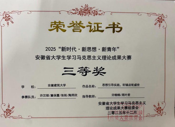 本网讯 近日,由安徽省教育厅主办、合肥工业大学承办的2025年“新时代•新思想•新青年”安徽省大学生学习马克思主义理论成果大赛圆满落下帷幕。经激烈角逐,我校推荐的4件作品斩获佳绩,荣获一等奖1项、二等奖1项、三等奖2项,两位教师获评优秀指导教师。