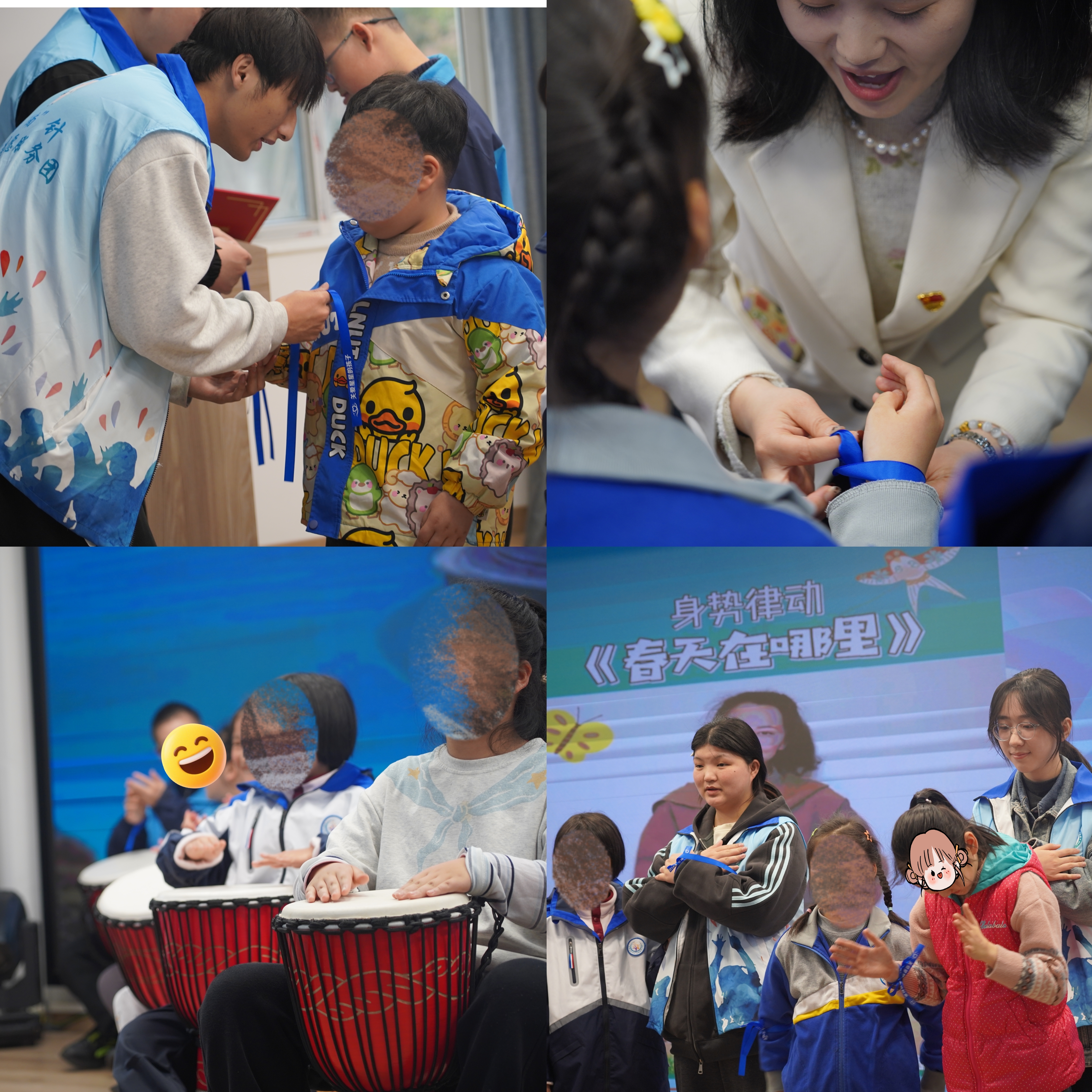 在特教学校的报告厅,一场充满仪式感的“蓝色星光”活动拉开帷幕。志愿者们为每一位孩子系上象征接纳与关爱的蓝色丝带,孩子们的眼神从最初的陌生逐渐变得明亮。随着《春天在哪里》的旋律响起,志愿者们带着孩子们拍手、跺脚,用简单的律动打破隔阂。同时,特教学校的师生用一场精彩的非洲鼓表演《我骄傲我生在中国》征服了全场,自信的节奏让在场的大学生志愿者们无不动容。