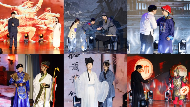决赛现场,各节目依次登场。《红铁》与《肩承千钧诺·心筑万仞梁》以情景朗诵直抒胸臆,用铿锵有力的语调诠释了当代建设者的钢铁意志与青年担当;《赤壁清风·古韵回响》《诗心筑担当》通过经典吟唱,婉转抒怀间赋予千年诗词新的文化底蕴与担当精神;《从军行》《社稷担当·苏武旌歌》运用话剧舞蹈等艺术手段,生动再现了戍边将士的豪情壮志与苏武坚守气节的先贤风骨;《千古一表·匡世之责》《与妻书》以微型舞台剧形式,细腻刻画了诸葛亮鞠躬尽瘁的忠肝义胆与林觉民烈士舍家为国的赤子情怀;《青年说》《时代的五四精神》则以昂扬向上的表达,彰显了新时代青年传承五四薪火、勇担时代使命的蓬勃朝气。
