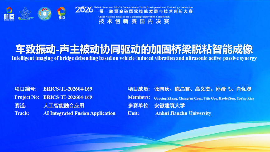 本网讯 近日,由金砖国家工商理事会中方理事会、一带一路暨金砖国家技能发展国际联盟、中国发明协会主办,厦门市金砖未来技能发展与技术创新研究院承办的2026一带一路暨金砖国家技能发展与技术创新大赛技术创新赛项全国总决赛圆满落幕。土木工程学院张国庆、陈昌君、高义杰、孙浩飞、肖优澳五位同学凭借作品《车-振-声协同赋能:CFRP加固桥梁隐疾的智能声振可视化》,在全国参赛队伍中脱颖而出,斩获人工智能融合应用赛道金奖,同时位列赛道第一名。