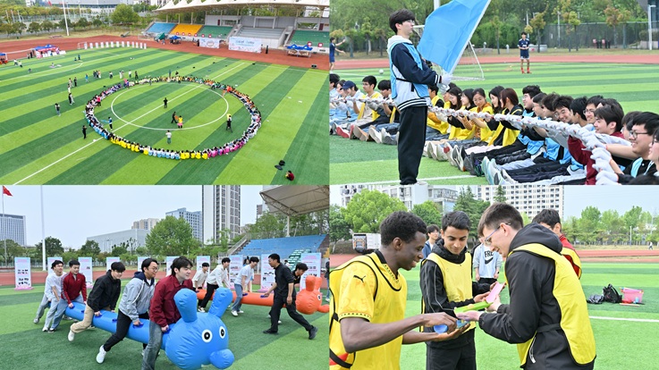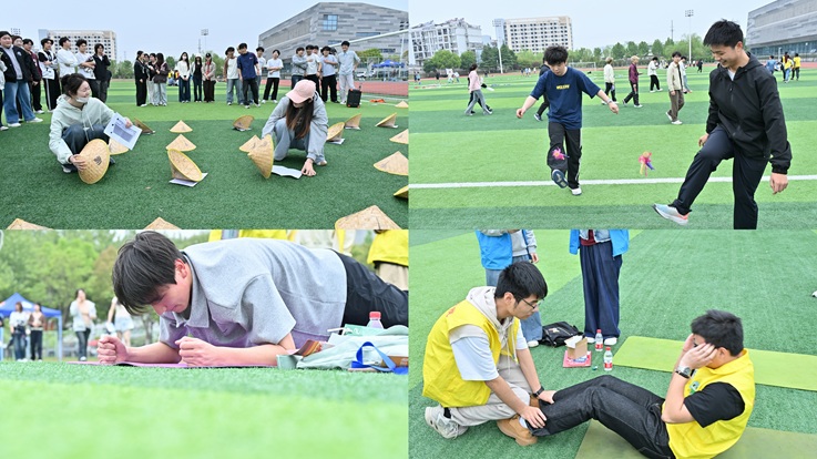 涂彩结束后,“奋进‘十五五’,‘宿’拓正当时”大型宿舍素质拓展活动火热开启。来自全校各学院40间宿舍代表共200余名同学携手围成巨大圆圈,紧握长绳、同心发力,共同完成“动力圈”挑战,生动诠释了“1+1>2”的团队力量。随后,各位同学以宿舍为单位体验“宿舍违规物品连连看”“汉诺塔”“极速60秒”“移动高尔夫”“击鼓颠球”“疯狂的毛毛虫”6项素质拓展活动,舍友们分工协作、配合默契,现场欢声笑语不断,参与同学在互动中增进了友谊,在协作中凝聚力量,磨砺了品格、坚定了信念。