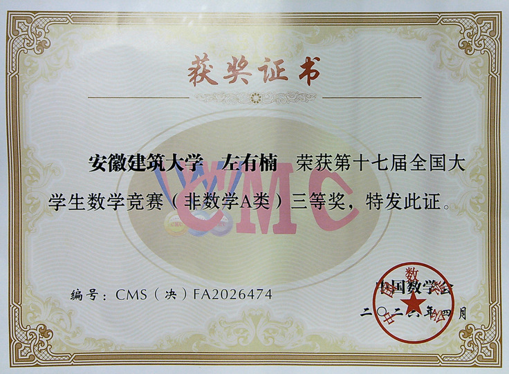 安徽建筑大学精心组织,我校学生左有楠同学经过校级选拔、省级初赛等多轮严格筛选,一路过关斩将,成功晋级全国决赛,并最终荣获非数学A类国家三等奖。这一成绩不仅刷新了我校在该项全国性高水平数学竞赛中的历史最好纪录,更实现了零的突破,充分彰显了我校学子扎实的数学功底、严谨的逻辑思维和出色的临场应变能力。