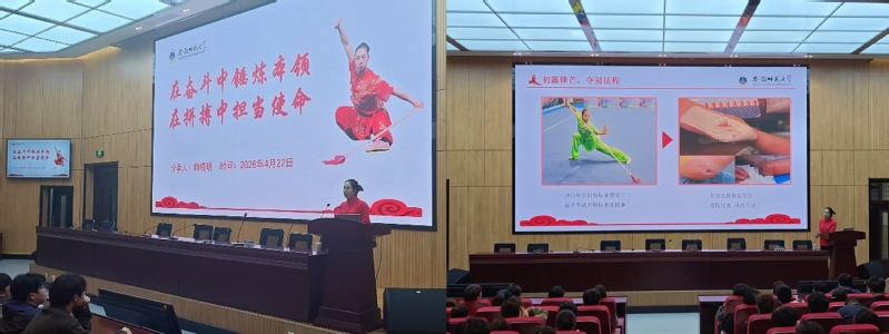 报告会上,赖晓晓结合自身习武成长与夺冠历程,以真挚朴实的语言,回顾了自己从地方队到国家队、从默默无闻到斩获全运会、世锦赛、世运会、亚运会等赛事荣誉、实现职业生涯“大满贯”的逐梦之路。她讲述了日复一日的艰苦磨砺,面对伤病与挫折时的坚韧坚守,以及心怀家国、为国争光的初心使命,生动诠释了“台上一分钟,台下十年功”的深刻内涵。结合我校工科办学特色,她寄语在场同学:“习武与治学,道理相通,皆需沉心深耕、夯实根基、苦练本领。希望大家以坚韧毅力攻克专业难关,以拼搏姿态练就过硬学识,把青春理想融入强国建设、民族复兴的时代征程。”朴实而有力的话语,赢得全场阵阵掌声,深深触动了在场师生。
