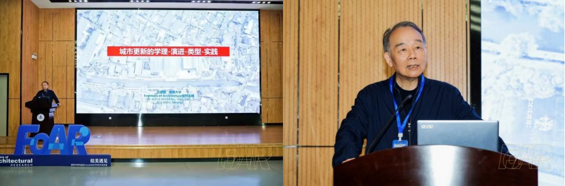 主旨报告环节,王建国院士以“城市更新助力城市高质量发展”为题,围绕城市更新的学理、演进、类型与实践,系统阐述了相关关键问题与方法论框架。他指出,我国城市发展已从“大规模增量建设”转向“存量提升增效”,城市更新是现代化城市建设的重要抓手。报告中,王建国院士提出“城市生命有机体”理念,构建“三代城市更新”理论框架,批判了“一刀切”的管控模式,并以广州历史城区为例,给出了城市精细化治理的具体思路。同时,王建国院士将城市更新归纳为三大实践类型,提出“保、改、活、用、进”的方法体系,客观分析了当前城市更新面临的产权、制度等难点问题,以及其中蕴含的创新机遇,强调城市更新需强化多主体协同,打造可持续再生的动态城市系统。