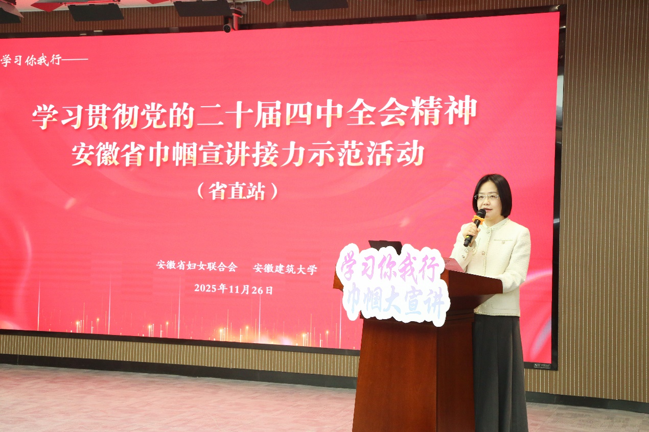 本网讯 为深入学习贯彻党的二十届四中全会精神,认真落实习近平总书记在全球妇女峰会上的主旨讲话精神,11月26日,由安徽省妇联主办、安徽建筑大学承办的安徽省巾帼宣讲接力示范活动在徽智楼报告厅拉开帷幕。安徽省妇联党组成员、副主席董志慧,校党委副书记李早出席活动并致辞。省直机关女干部代表、省女知识分子联谊会会员代表、省妇联机关干部代表与我校师生代表120余人共同聆听宣讲。