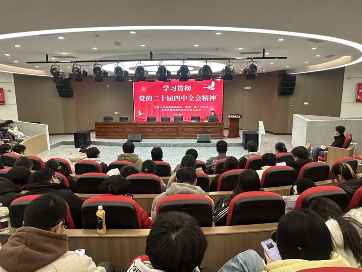 本网讯 为深入学习贯彻党的二十届四中全会精神,全面准确把握全会重大意义、丰富内涵和实践要求,根据省委教育工委和团省委相关工作部署,1月6日下午,学校在徽智楼报告厅举办党的二十届四中全会精神宣讲会。本次宣讲会特邀省委讲师团理论宣讲专家库成员、安徽大学商学院副院长、经济管理国家级实验教学示范中心主任叶江峰教授作宣讲报告。团委党支部全体成员,校、院两级学生骨干100余人参会。