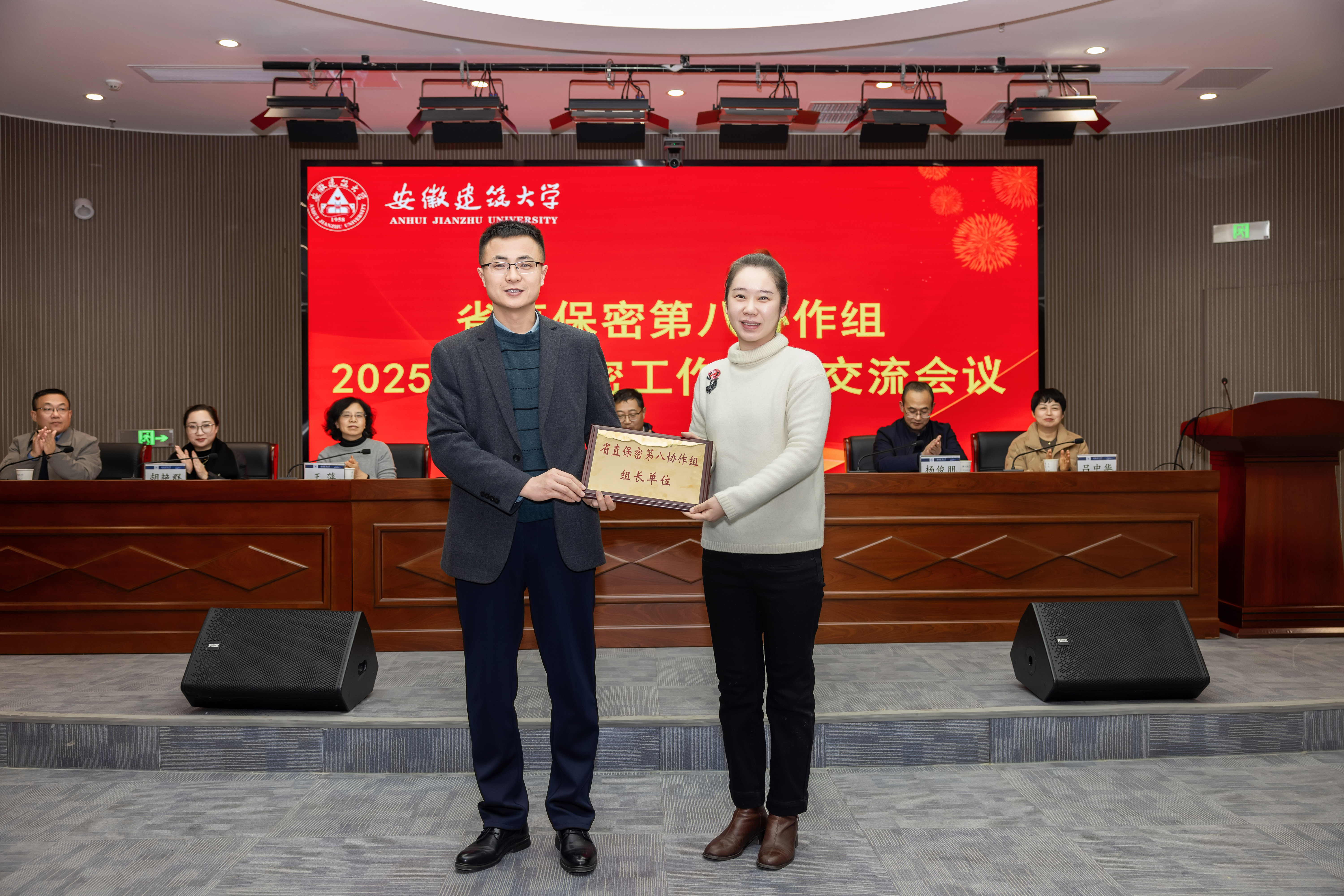 会议举行了2026 年协作组组长单位交接仪式。经各成员单位协商推荐并报省委保密办同意,安徽开放大学当选 2026 年组长单位,安徽艺术学院、安徽警官职业学院分别为第一副组长单位、第二副组长单位。我校办公室副主任葛建化代表 2025 年组长单位,向安徽开放大学办公室副主任谭冉移交协作组工作交接牌,标志着协作组工作正式平稳过渡。