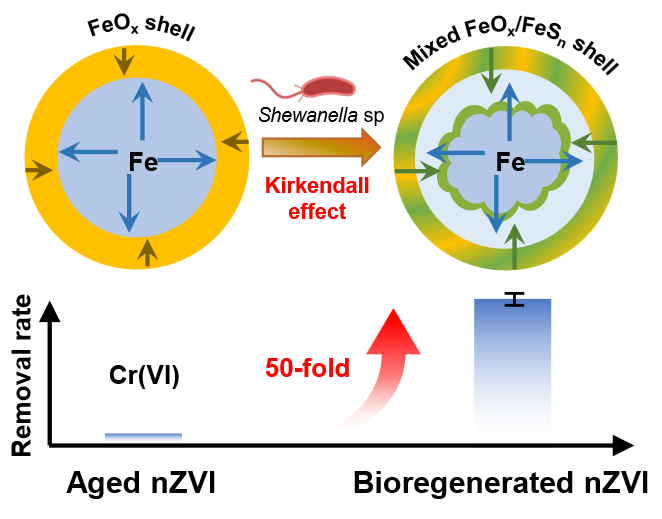 针对于此,本研究开创性地提出了基于异化金属还原菌Shewanella oneidensisMR-1诱导Kirkendall效应的老化nZVI生物再生新策略。结果表明,生物再生nZVI(BR-nZVI)表现出显著增强的污染物去除性能,其对 Cr(VI) 的去除速率常数较A-nZVI提高约50倍,同时具备更优异的环境适应性和循环稳定性。多种表征结果表明,生物成因铁氧化物/硫化物的非均相质量扩散触发了 Kirkendall效应,促进铁元素的优先向外迁移,从而形成了独特的“蛋黄-蛋壳”纳米结构。这种微生物诱导的Kirkendall效应显著提升了nZVI的比表面积、孔隙结构、疏水性及电子传递能力,从而有效促进污染物的还原去除过程。此外,该生物再生策略适用于多种硫源和不同粒径的ZVI,并在去除四溴双酚A等多种污染物方面表现出广泛的适用性。以上成果为零价铁基纳米材料在环境修复中的可持续应用提供了新的科学依据和技术支撑。