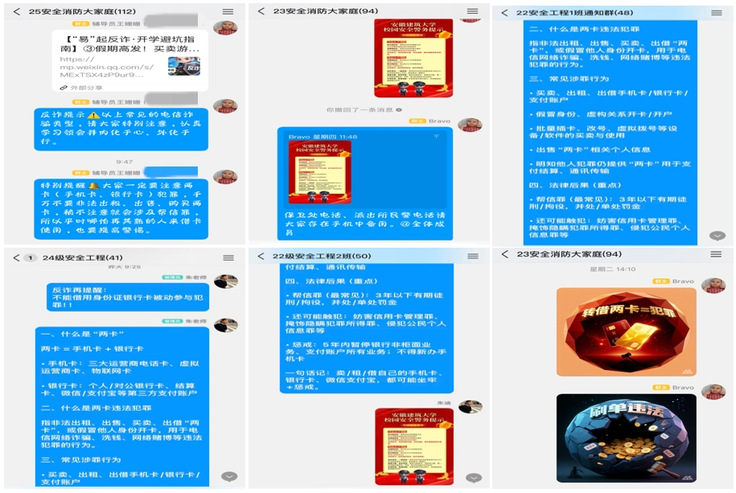 各学院严格落实工作要求,以“开学反诈第一课”为主题,结合专业特点与学生实际情况,开展了形式多样、务实高效的反诈宣传活动。数理学院充分运用微信公众号、班级 QQ 群等线上平台,构建全方位、常态化反诈宣传,及时推送反诈科普知识与预警提示,实现反诈信息精准覆盖、全员知晓。电信学院、机电学院聚焦高发诈骗类型,通过案例剖析、互动讲解开展警示教育,切实增强学生识骗防骗能力。材化学院、环能学院依托主题班会、公众号推文等形式普及防范知识与避险技巧,扩大宣传覆盖面,并结合校园典型案例拆解骗局、强化提醒。安全科学与工程学院开展“反诈知识大比拼,安全意识入人心”主题知识竞赛活动,让反诈教育从“被动听”转变为“主动学、积极赛、乐于传”。公管学院通过知识竞赛、情景模拟等形式,将反诈知识转化为趣味化、互动化的学习过程,真正内化于心、外化于行,实现从“被动接受”到“主动学习”的转变。