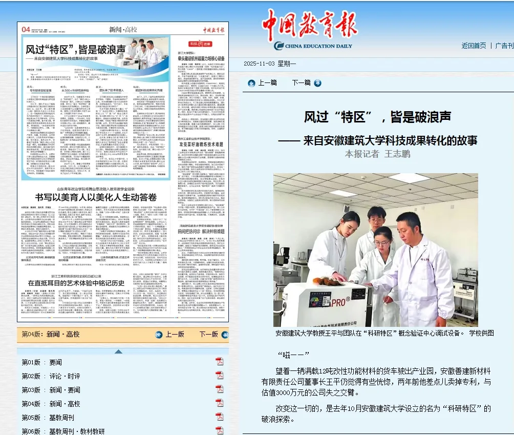 11月3日,《中国教育报》第04版“新闻·高校”版面以“风过'特区',皆是破浪声—— 来自安徽建筑大学科技成果转化的故事”为题报道我校“科研特区”科技成果转化工作。