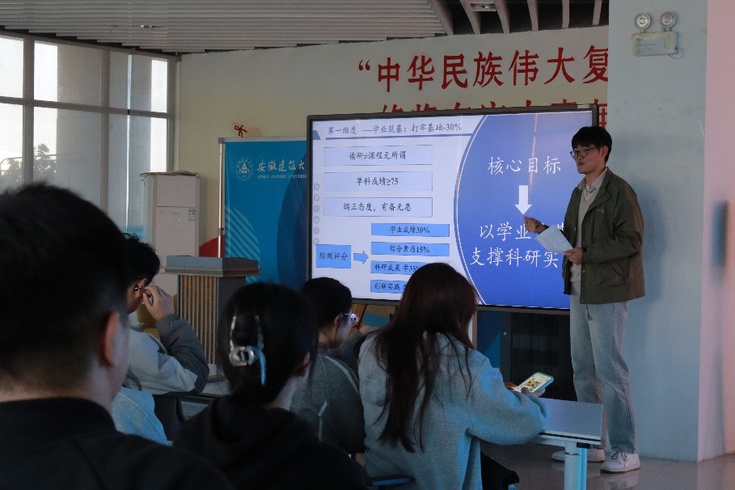 本网讯 为持续深化科研育人,赋能研究生科研创新能力高质量发展,我院学术活动“材睿论坛”系列讲座持续深入推进。2025年10月23日,第七期材睿论坛于逸夫楼三楼易班活动中心成功开讲,本期特邀研究生朱嘉豪担任主讲,围绕学业、科研与竞赛等热点问题为同学们带来了一场内容丰富的学术报告,现场学术氛围浓厚。
