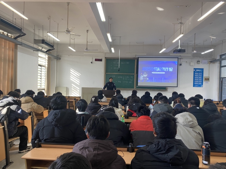 本次主题班会特别邀请经开区锦绣派出所民警唐卫东莅临现场,为同学们开展反诈知识宣讲。唐警官结合自身丰富的一线办案经验,带来了一场深入浅出的宣讲。他首先介绍了当前电信网络诈骗的严峻形势与常见手段,结合一个个鲜活真实的案例,深入剖析了诈骗分子的作案心理与惯用伎俩。从冒充熟人借款、虚假网络贷款到刷单返利等骗局,唐警官的讲解让同学们深刻认识到,诈骗并非遥不可及,且形式多样、防不胜防。