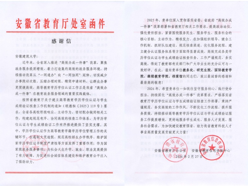 本网讯 日前,学校收到安徽省教育厅办公室、安徽省教育信息咨询中心发来的感谢信,为我校高效完成各类学历学位认证与学生成绩验证核查任务、得到教育部有关部门和广大毕业生充分认可与一致好评,致以感谢和敬意。