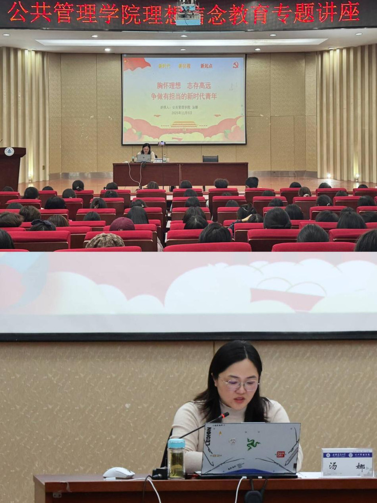 本网讯 为深入贯彻落实立德树人的根本任务,引导2025级学生坚定理想信念,锚定正确人生方向,11月5日下午,公管学院在图书馆二楼报告厅和分会场C405教室举办2025级新生理想信念教育专题讲座,410名2025级新生参加了本次讲座,学院党委副书记(主持工作)汤娜担任主讲。