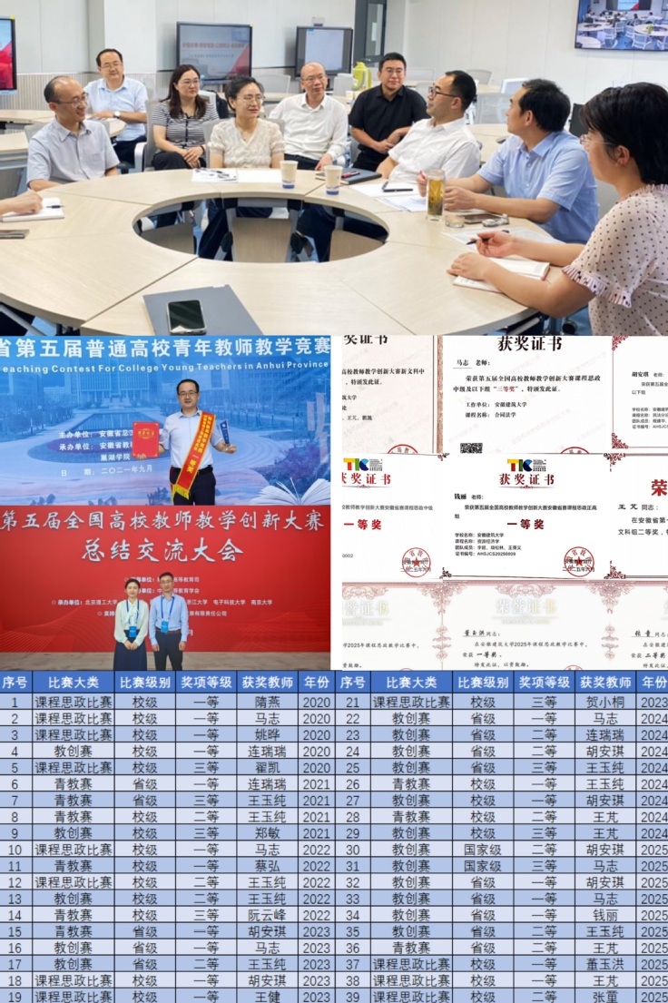 教学质量笃行实干结硕果。“十四五”期间,教师教学竞赛成绩突出,获全国教师教学创新大赛二等奖1项、三等奖1项,安徽省教师教学创新大赛一等奖5项、安徽省高校青年教师教学竞赛一等奖2项,其他省级或校级教学竞赛获奖30余项,教师教育教学能力普遍显著提升。累计获批国家级一流课程1门,省级一流课程3门,在高等教育出版社等出版教材10部,在SSCI等重要期刊发表教研论文39篇,课程建设、教材建设与教学研究成效显著。获教育部产学合作协同育人项目立项累计12项,省级质量工程立项数量累计32项,中国建设教育协会课题累计立项12项,教学质量工程项目建设量质齐升。此外,国家级新文科研究与实践项目推荐出校1项。