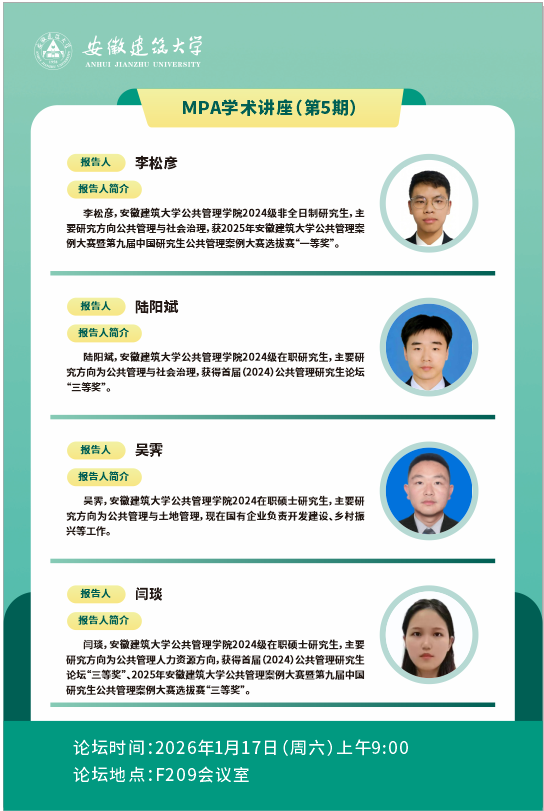 本网讯 为拓宽学生学术视野、激发创新思维,助力公共管理领域理论与实践深度融合。1月17日上午9点,公管学院在F209会议室举办了MPA学术讲座(第5期)。本次讲座以公共管理领域热点问题研究与实践探索为主题,邀请了2024级MPA研究生陆阳斌、闫琰、吴霁与李松彦等4位同学分享学术成果,吸引了众多学生参与,现场学术氛围浓厚。