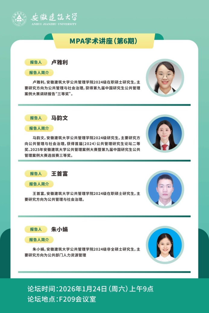 本网讯 为进一步拓宽学生学术视野,激发学术创新思维。1月24日上午9点,公管学院在F209会议室举办了MPA学术讲座(第6期)。本次讲座以公共管理领域热点议题为核心展开交流,邀请了卢雅利、马韵文、王首富、朱小娟等四位2024级MPA研究生进行学术分享,吸引了众多学生参与,现场氛围热烈,学术气息浓厚。