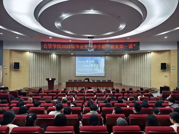 本网讯 为进一步帮助2026届毕业生精准把握就业形势、树立科学择业观,3月20日下午,公管学院在金寨路校区图书馆二楼报告厅开展2026届毕业生春季学期“就业第一课”。公管学院院长黄佳豪担任授课人,毕业班辅导员及全体2026届毕业生到场聆听、参与学习。