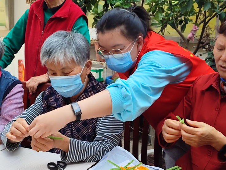 在社区居民活动中心,同学们身着志愿者服装,帮忙搬桌椅,耐心教老人做手工,亲切交谈,拉近了与老人的距离。通过交流深入了解老人对社区养老服务设施需求、社区养老服务存在的问题及改进建议。整个活动过程,氛围轻松愉快,受到老人们的高度赞赏。