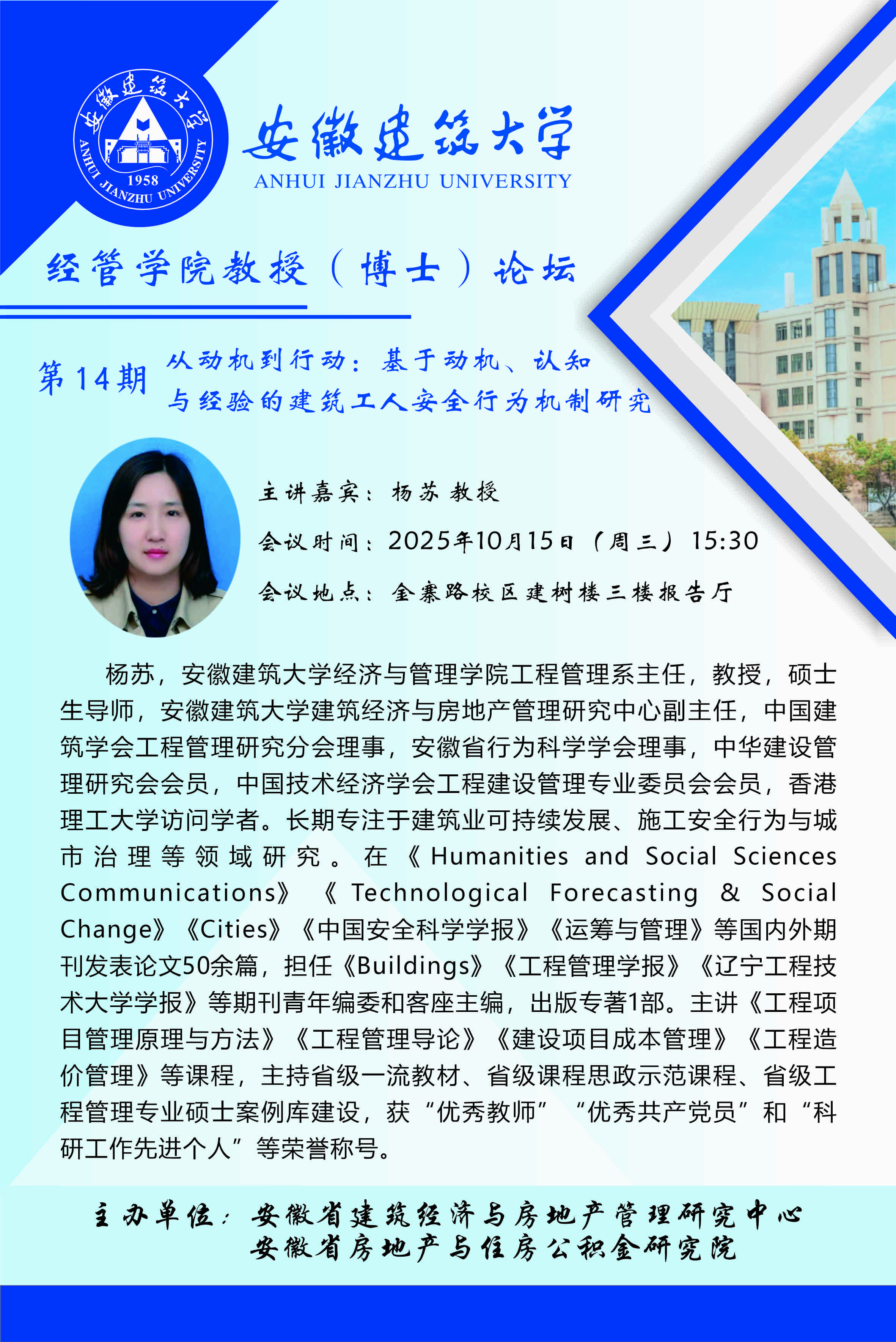 【预通知】经管学院教授(博士)论坛 从动机到行动:基于动机、认识与经验的建筑工人安全行为机制研究