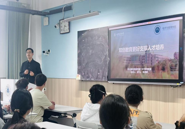 在结束“劳动教育第一课”后,“双创教育第一课”在徽学楼1501教室接续举行,聚焦“双创教育更好支撑人才培养”这一核心主题。蔡弘从顶层设计入手,系统阐释了学院双创工作的目标与原则,并详细介绍了学校支持学生项目的全方位政策与服务保障体系,向新生们传递了学院“全力支持、全程服务”的明确信号与坚定决心。