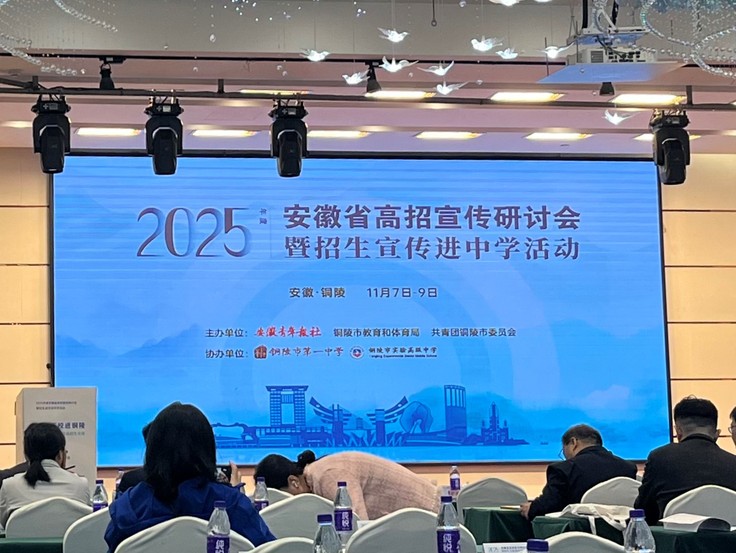 高招宣传研讨会于11月8日上午开展。会议伊始,铜陵市相关领导介绍了铜陵市的教育发展概况与人才培养优势,为高校招生提供了重要的地方政策与生源信息。在研讨交流环节,多所省内外优秀高校带来了各具特色的招宣工作“金点子”。其中,华南理工大学分享了其实现安徽省内地市全覆盖的“一二三四”招宣模式,强调了精准化、常态化宣传的重要性;江南大学则聚焦于“主动求变”,分享了如何通过优化专业结构、强化学院主体地位来提升招生成效;大连理工大学关于2025年在皖招生工作亮点的介绍,也为我院提供了宝贵的全链条育人思路。这些前沿的理念和务实举措,为我院改进招宣策略、创新工作方法提供了丰富的借鉴。