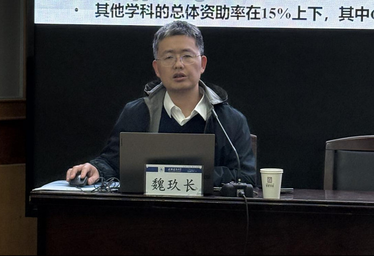 彭志胜在开场致辞中对魏玖长教授的莅临表示热烈欢迎。他指出,“易海大讲堂”作为学校品牌学术活动,始终致力于追踪学术前沿,启迪创新思维,本次邀请顶尖学者分享宏观政策领域的前瞻动态,对提升学院科研水平和人才培养质量具有重要意义。魏玖长教授以“宏观管理与政策领域的学科发展态势分析”为主题,进行了一场系统性强、信息密度高的深度分享。他首先梳理宏观管理与政策领域学科发展基础态势,分析主题关联、项目资助与论文发表情况,明晰学科相似性与研究主题演变规律。然后,聚焦人工智能与该领域的融合发展,解读相关项目研究重点与资助趋势,提出“十五五”期间重点选题方向,介绍多阶段调研思路与专家研讨成果。最后,明确各分支学科发展定位,梳理重点研究领域与核心选题,构建学科重点选题关键词关联网络,为学科高质量发展提供思路与参考。