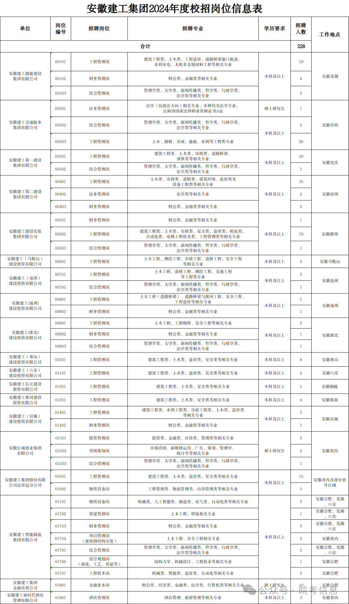 详见附件《安徽建工集团2024年度校招岗位信息表》、《安徽建工集团2024年度社招岗位信息表》。