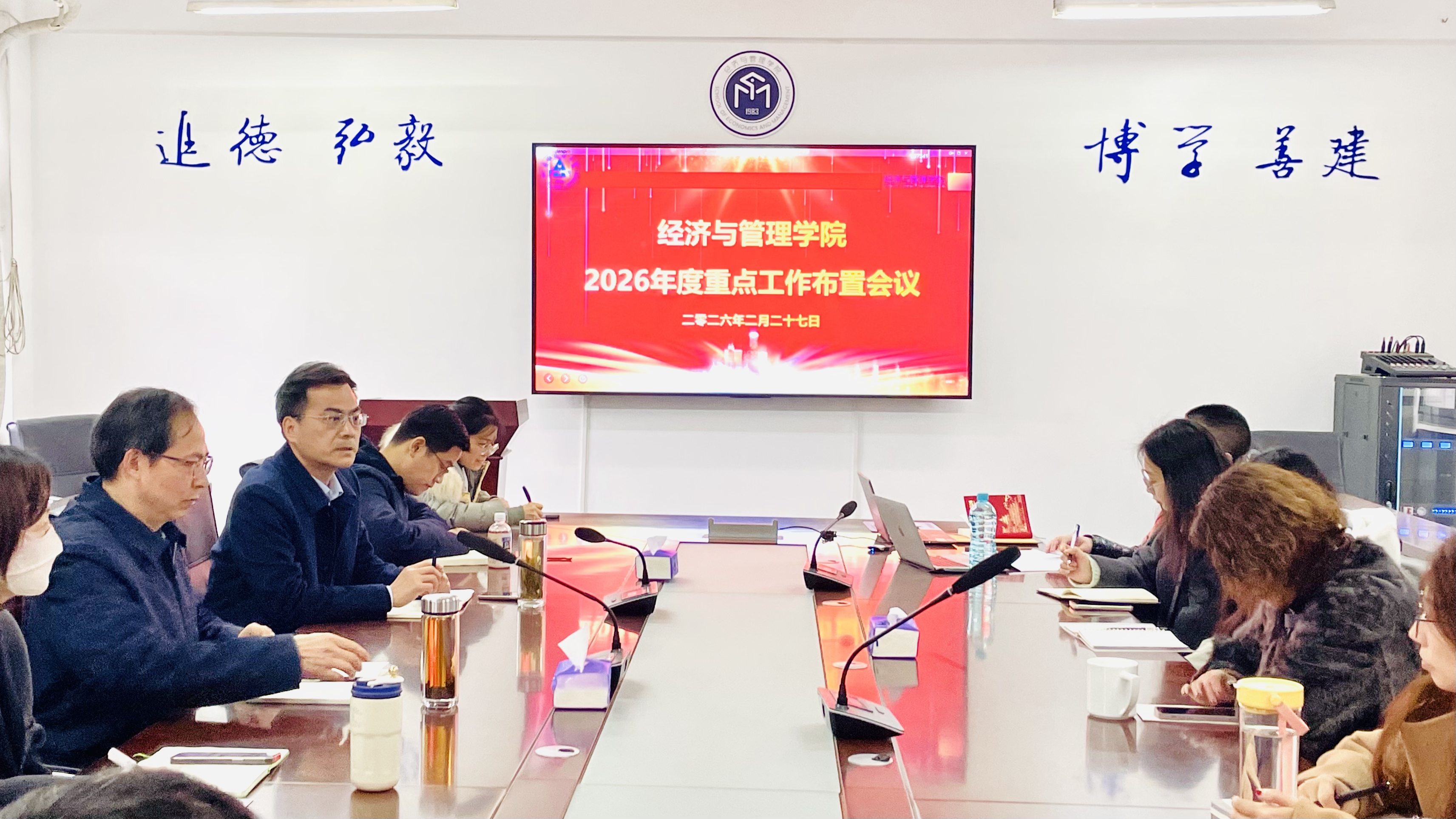 本网讯 为统筹推进学院各项工作高质量发展,锚定“十五五”发展目标,明晰2026年度核心工作任务,2月27日上午,经济与管理学院在金寨路校区F404会议室召开2026年度重点工作布置会。会议由院长彭志胜主持,学院党政领导班子成员及全体行政人员参会。