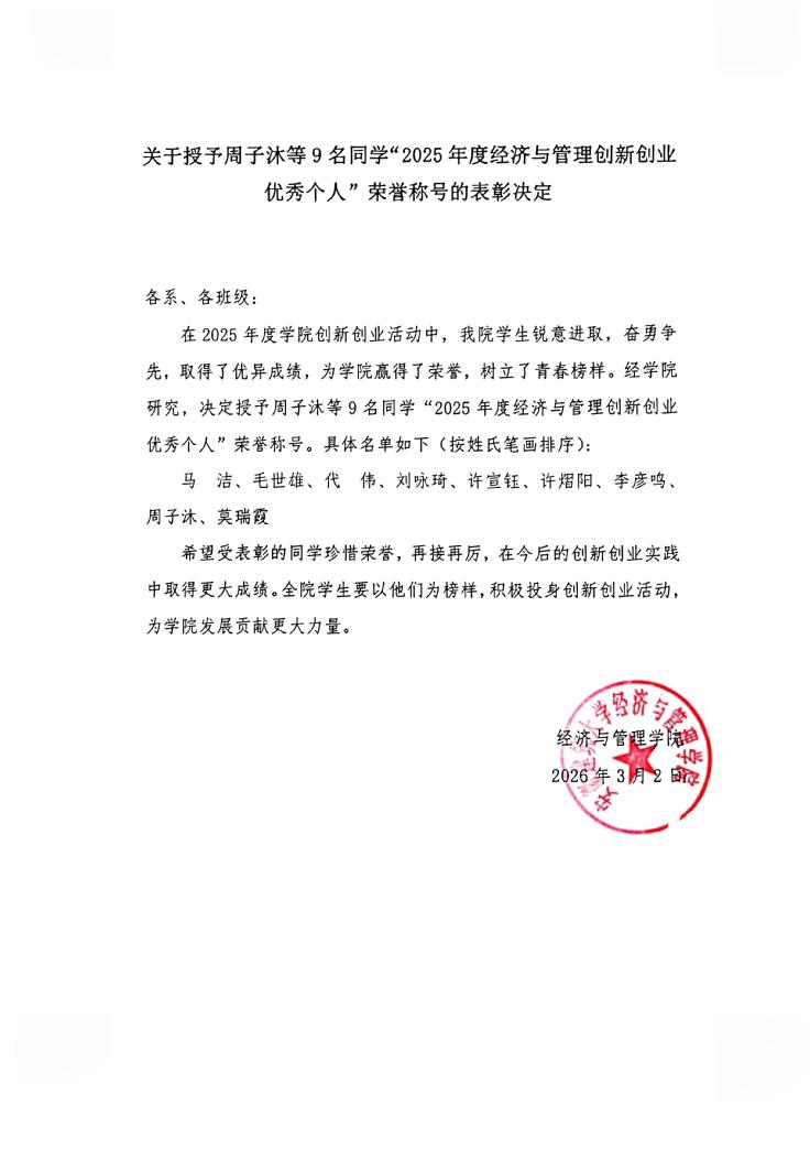 关于授予周子沐等9名同学“2025年度经济与管理创新创业优秀个人”荣誉称号的表彰决定