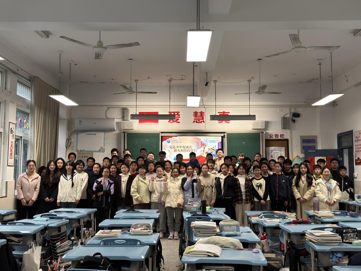 在之后的互动环节中,党员们与初中生们展开了面对面的真诚交流。同学们围绕入团标准、大学专业选择等话题踊跃发言,支部党员们细致解答,并为参与互动的少年们送上了精心准备的文具礼品。这些奖品承载着党支部的关怀与期待,旨在鼓励同学们在未来的学习生活中不断进取、立志成才。双方对此次高校与中学联动的实践模式表示高度认可。最后,全体参与人员合影留念,为本次宣讲画上了圆满句号。
