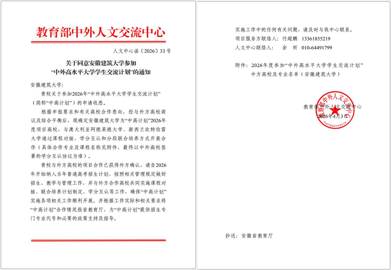 本网讯 4月3日,教育部中外人文交流中心正式发函,批准安徽建筑大学参与2026年“中外高水平大学学生交流计划”(简称“中高计划”)。我校经济与管理学院安徽省一流本科专业会计学专业成功入选,将与澳大利亚QS排名TOP100高校阿德莱德大学,以“2+2”学分互认模式开展联合培养。这一成果标志着学院在国际化办学、人才培养模式改革上取得突破性进展,对提升学科建设水平、扩大学校国际影响力具有重要意义。