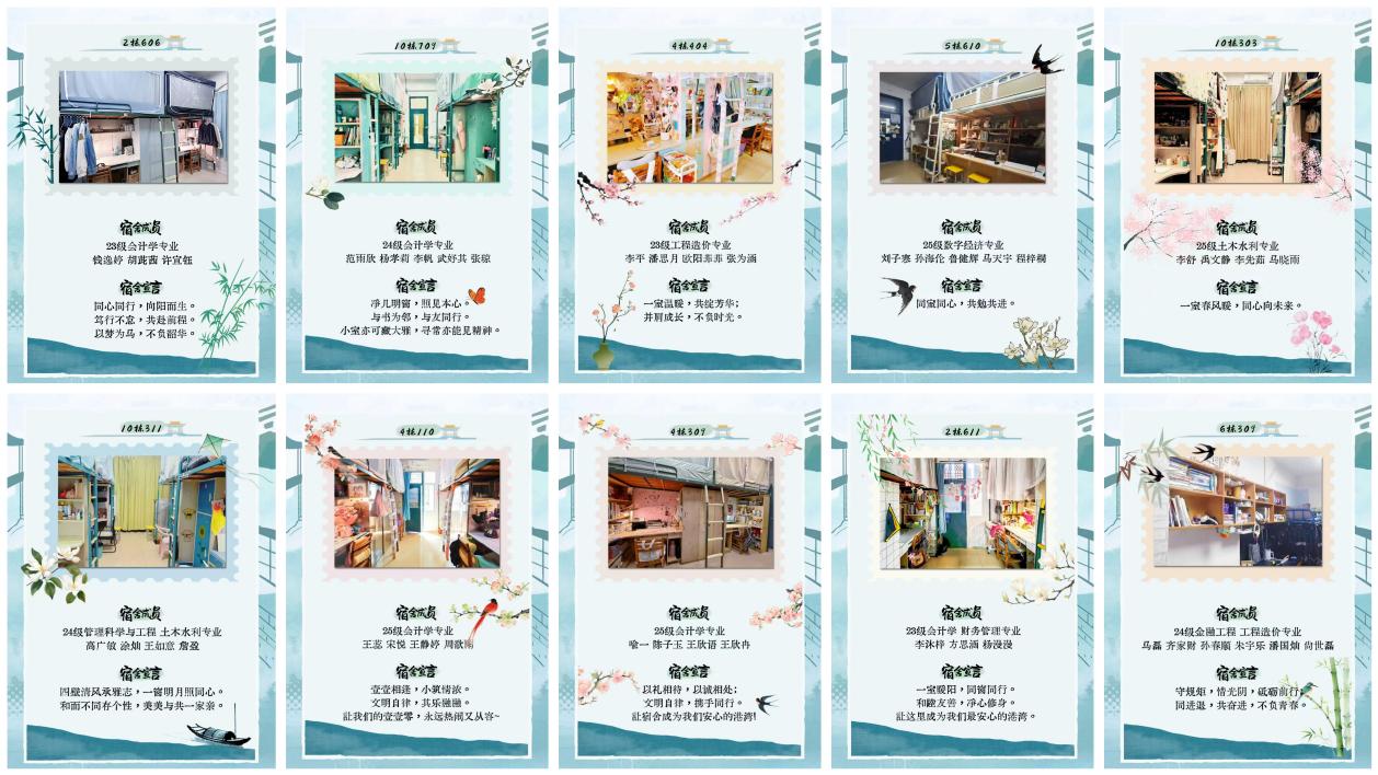 经过自主申报、择优推荐、综合评审等环节,最终评选出2栋606等10间特色鲜明、氛围浓厚、文明向上的优秀宿舍,以寝室小阵地彰显校园大风尚,用青春巧思书写文明新篇章。
