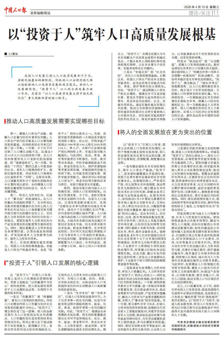 本网讯 4月15日,国家级人口领域权威媒体《中国人口报》理论版整版刊发经济与管理学院青年教师撰写的理论文章《以“投资于人”筑牢人口高质量发展根基》,系统阐释我国人口高质量发展的核心路径与实践框架,为新时代人口治理转型提供学术支撑与政策参考。