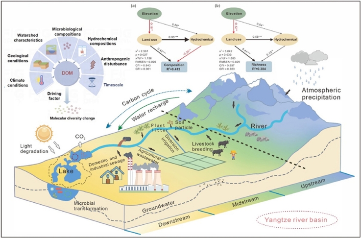 研究综合运用傅里叶变换离子回旋共振质谱、三维荧光光谱与水同位素技术,系统解析了长江流域九大子流域中DOM的组成、来源及其驱动因素。研究发现,长江流域DOC浓度整体较低(均值3.17 mg/L),DOM以类腐殖质和类木质素组分为主,表现出显著的陆源输入特征。空间上,鄱阳湖流域CDOM浓度和芳香度最高,嘉陵江流域类腐殖质组分占比最大,而太湖流域受人类活动影响显著,表现出较高的蛋白质类组分和内源贡献。研究进一步揭示,水同位素(δ²H-H₂O)与DOM光学和分子指标显著相关,土地利用类型和人类活动是驱动DOM组成与多样性的关键因素。该研究构建了“光学-分子-同位素”多维分析框架,为大尺度流域DOM源解析与碳循环研究提供了新方法与科学依据。(作者:陈星 一审:侯晓云 二审:黄健 三审:谢发之)