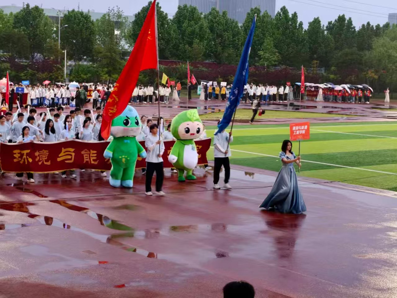 本次运动会开幕式上,环能学院代表队着装统一,步伐铿锵,微凉细雨丝毫没有动摇全院师生拼搏奋进的决心!值得一提的是,学院吉祥物环宝灵动可爱的模样为本次运动会增添了不少活力,也让不少观众直呼心动。
