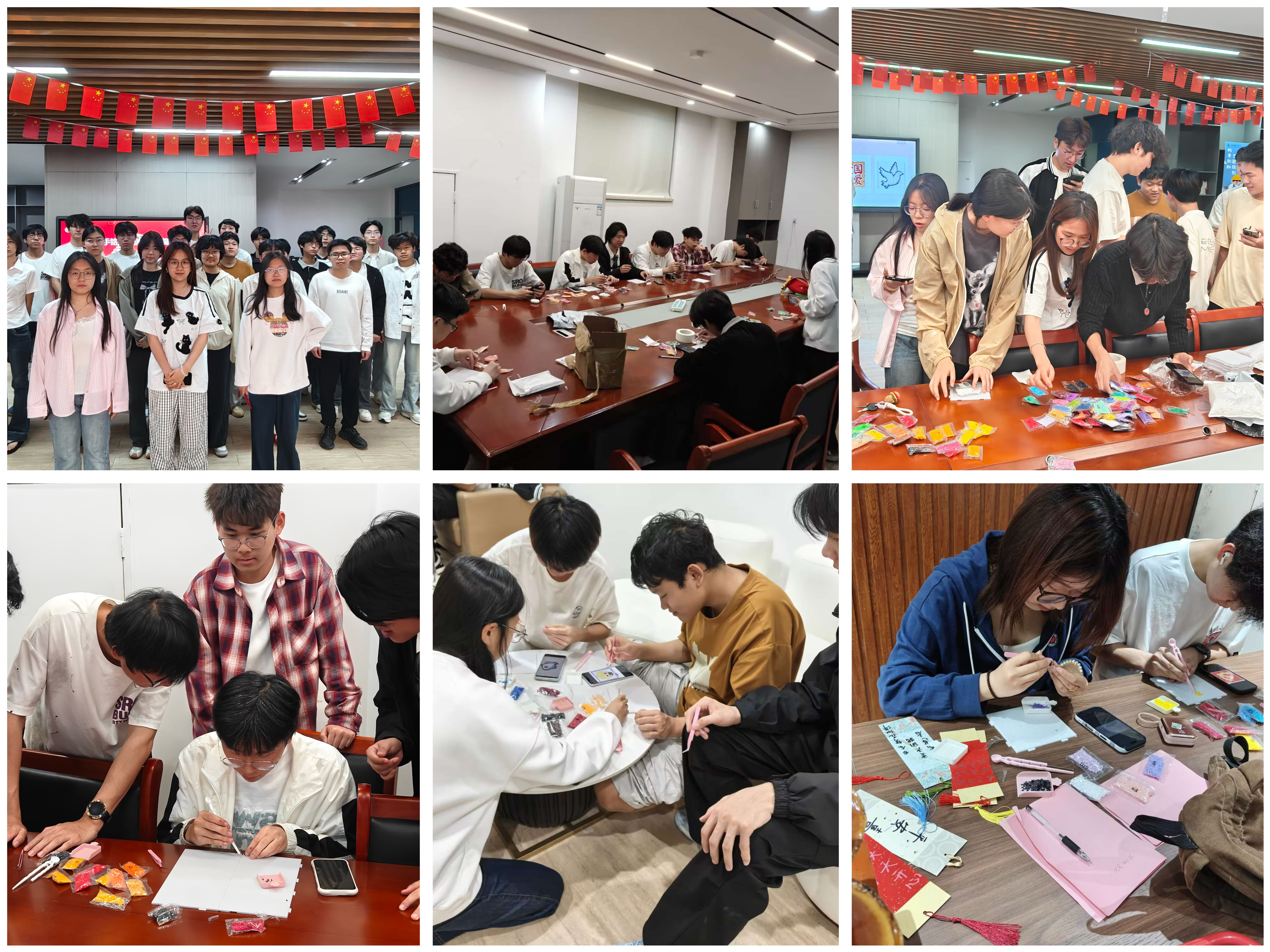 4月26日晚,环能学院25级建环专业团支部在“一站式”学生社区5号楼二楼连廊,开展“巧手铭记党史,同心共绘新程”主题团日活动。活动以创新形式传承红色基因、厚植爱国情怀,推动习近平新时代中国特色社会主义思想入脑入心。团支书随艺茹、方宇细致讲解拼豆操作规范与模板对照技巧,同学们随机组队、全情投入,指尖翻飞间,用镊子将一颗颗彩豆精准排布,将国徽国旗、红色信仰、青春理想等元素融入作品。零散豆粒在巧手中汇聚成型,红色精神也在创作中实现可视化、仪式化的生动表达,现场氛围热烈而专注,青年学子在实践中感悟初心、汲取力量。